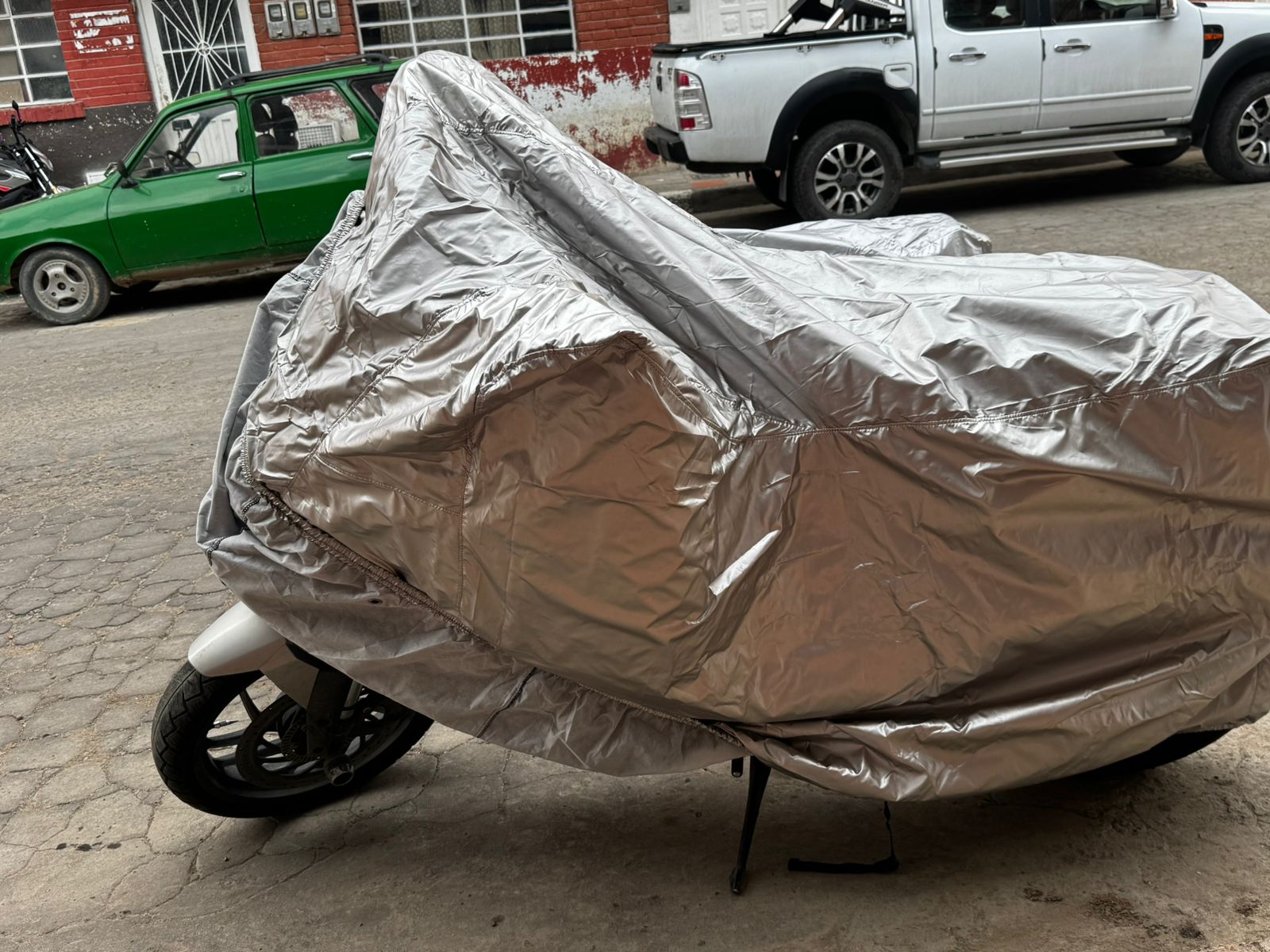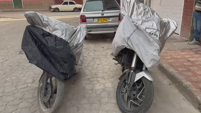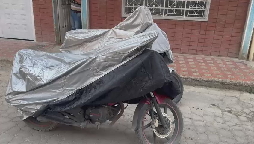 Funda/Pijama Premium para moto — Alta Resistencia. Exterior Silver Poliéster + interior acolchado para proteger del sol (UV), lluvia intensa, polvo y rayones. Incluye tula de guardado y correa con chapa para fijación segura.
